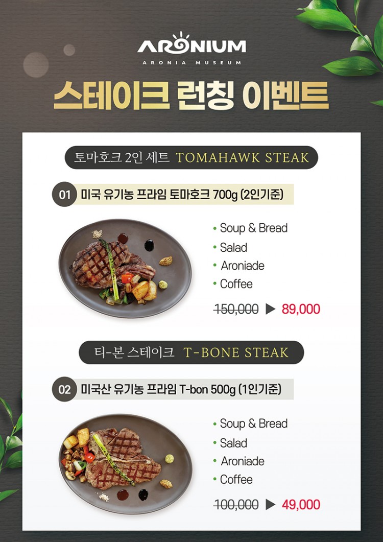 아로니움 스테이크 런칭 EVENT 페이지 정보 작성자 아로니움 댓글 0건 조회 889회 작성일 22-02-18 17:40 본문 아로니움 스테이크 런칭 EVENT1. [토마호크 2인세트]미국 유기농 프라임 토마호크 700g (2인 기준)- Soup & Bread- Salad- Aroniade- Coffee150,000 -> 이벤트가 89,000원2. [티-본 스테이크]미국 유기농 프라임 T-bon 500g (1인 기준)- Soup & Bread- Salad- Aroniade- Coffee100,000 -> 이벤트가 49,000원본 이벤트는 1월 31일자로 마감되었습니다. 목록 다음글아로니움 피자 EVENT 22.02.18 댓글목록 댓글목록 등록된 댓글이 없습니다.
